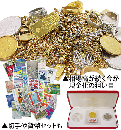 逗子市役所目の前に開業して5年目を迎える同店では不要になった品々を1点1点丁寧に査定。チェーンが切れてしまったネックレスや片方だけのイヤリング、デザインが古くなった指輪も買取対象だ。金やプラチナは昨年から相場の好調が続いており、わずか数点でも驚くほどの値がつく可能性がある。「相場高はいつまで続くか分からないので今が売り時。査定は無料なので1点からでもお気軽にご持参下さい」と同店は話している。また、かつてコレクションした切手や古銭。特に使用機会が減った切手は額面以上の価値は今後つきづらく、眠らせたままならいっそ現金に換えてしまうのも賢い選択肢と言える。その他高級洋酒やブランド品なども買取品目も豊富。回りを見渡して「これはどうかな」と思うものがあれば気軽に左記へご相談を。