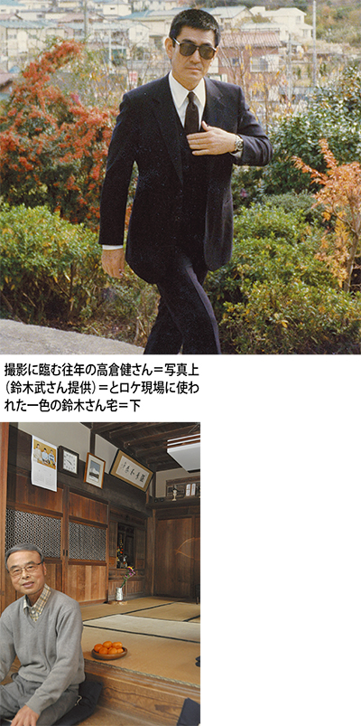 葉山町が登場するのは高倉さんが病床の父を見舞いに生家を訪れるシーン。設定上は倉敷(岡山県)だが、当時偶然近くを通りかかった映画スタッフが町内にあった趣きのある民家に目を留め、ロケ場所として使わせてほしいと依頼したという。撮影現場になったのは一色にある鈴木武さん宅。木造の邸宅は今年築100年を迎えるといい、外観は一部改装をしたものの、現場となった縁台や仏間も当時そのままに残されている。撮影に臨む高倉さんを目にしたという鈴木さんは「当時50歳くらいで役者としていい時期だったんじゃないかな。直接は話していませんが気取った感じがまるでなくて恰好良かった」と印象を振り返る。