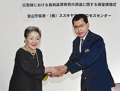 同署には非常時の備蓄としてアルファ米や缶詰、飲料水などを備えるが、量は署員全員が口にした場合の2日分程度。東日本大震災のように救助活動が長期化する場合の安定した食料の受給ルートがなく、同署が協定締結を要請していた。締結式で中村社長は「災害時に助け合うのは当然。できることをしたい」、泉山署長は「快く引き受けていただき、大変心強い」と感謝した。