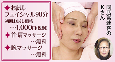 お試しフェイシャルは90分千円(税別)。会員なら施術60分のコースを何度でも同じ価格で利用できる。その他、ビジターコースなども多種。しつこい勧誘なし。一度足を運んでみては。