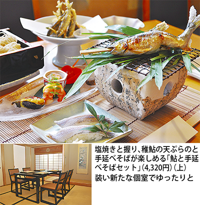 この時季のおすすめは前菜、塩焼き、握り、稚鮎の天ぷらと手延べそばにデザートがつく「鮎と手延べそばセット」。香ばしい鮎とのど越し爽やかなそばとの取り合わせは絶品。お酒好きには真子と白子を合わせた「うるか」も。8月末までの限定。ぜひ堪能しては。