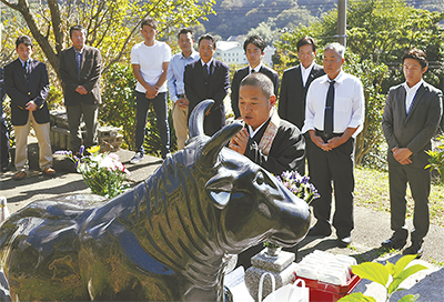 ブランド牛として知られる葉山牛を生産する「三浦半島酪農組合連合会」(石井廣会長)は先月28日、上山口の新善光寺で「牛供養」を行った。日頃食肉として解体される牛を弔うために毎年行っている恒例行事で、この日は山梨崇仁町長や地元選出の国会議員らも出席。牛魂碑の前で手を合わせ、供養を願うとともに感謝の祈りを捧げた。