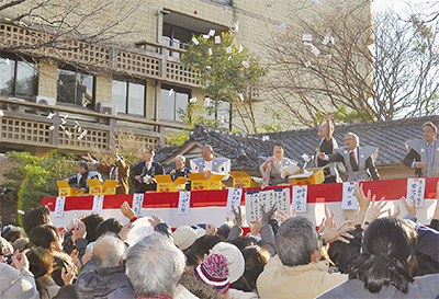 逗子の亀岡八幡宮で3日、恒例の節分会が行われた。年男や年女らが掛け声とともに豆をまき、1年の幸福を祈願した。