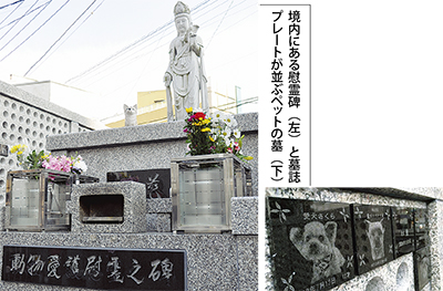 逗子市民交流センターの向かいにある同寺境内の一角にある供養墓。「動物愛護慰霊之碑」と刻まれた石碑と聖観世音菩薩像の隣には、愛犬や愛猫のプレートが並んでいる。