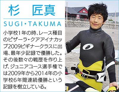 杉君は逗子海岸でインストラクターをしている父・純太郎さん(50)の影響で小学1年生のときに本格的に競技を始めた。初めて出場した逗子の大会では挫折こそ味わったものの、その後は「ジュニアウインドサーフィン選手権」で6連覇。大人を含む大会でも優勝や準優勝を重ねるなど才能を開花させていった。純太郎さんによると、杉君はアマチュアの年間ランキングで昨年1位。今年も首位をキープすればプロになれる可能性もある。中学生プロの誕生となれば、競技史上初だ。