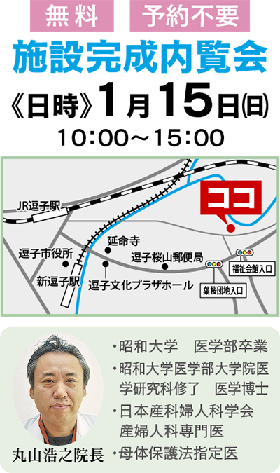 改築はこうした取り組みを拡充させるためのもので、小さい子どもと入院できる病室やキッズスペースを新たに設置。全面バリアフリー化し、設備面でも最新鋭の分娩監視装置を導入するなど一新した。内覧会では同院スタッフの案内で外来や病室、陣痛室などを見学できる。丸山院長は「お産や育児を一層サポートできる病院施設に生まれ変わりました。ご夫婦やご家族でお気軽にお越しいただければ」と話している。なお診療は通常通り(左記参照)。