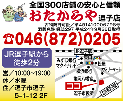 逗子市役所の斜向かい、亀岡八幡宮前のビル2階にある「おたからや逗子店」=写真=では豊富な実績と確かな査定でそうした品々を高く買取ってくれる。「貴金属についてはデザインが古くなったものや壊れたものでもOK。査定は無料なので、1点からでもお気軽にご相談ください」と頼もしい。京急新逗子駅から徒歩30秒、バス停からもすぐとアクセスも抜群で、気軽に査定が受けられるのも人気の理由だ。