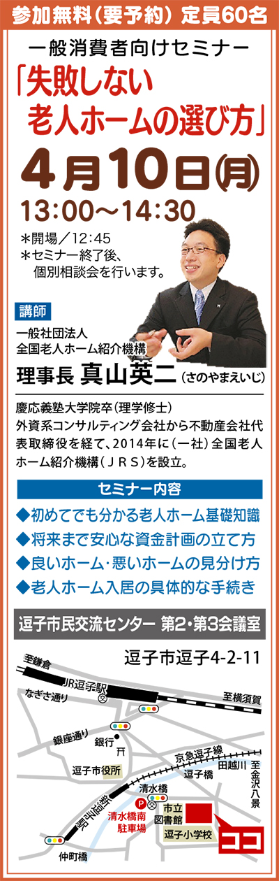 逗子市民交流センターで4月10日(月)、「失敗しない老人ホームの選び方」セミナーが開催される。午後1時から2時30分まで。参加無料。要事前申込み。