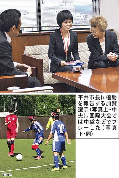 このほど、オーストリア・ウィーンで開催された視覚障害者によるブラインドサッカーの女子国際大会に、桜山在住の加賀美和子選手(37)が日本代表として出場し、チームの初優勝に貢献した。12日には逗子市役所を訪れ、平井竜一市長に優勝を報告。今大会を振り返るとともに今後の活躍を誓った。