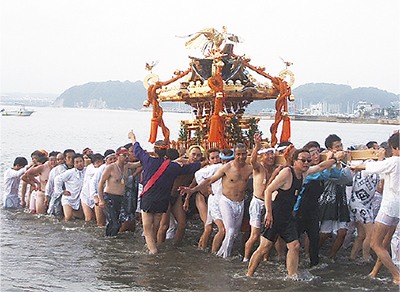 森戸、三ヶ浦、あずま、真名瀬、元町高砂の5町内会による神輿は8日午後2頃出発。それぞれ町内を練り歩いて神社に向かう。森戸海岸での合同渡御は3時45分、海の中で神輿を担ぐ真名瀬の「浜降り」=写真=は4時10分からを予定。