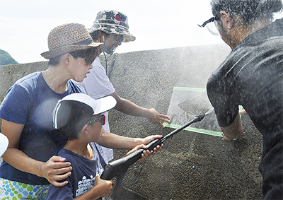 ”キャンバス”は逗子マリーナ裏手にある約218mの護岸。生き物の形に切り抜いたアクリル板に勢いよく水を吹き付けると白いシルエットが浮かびあがった。この日は30度を超える猛暑日で、子どもたちは水しぶきを浴びながら約30mを制作。参加した小坪小6年の江村桃さん(6)は「上手に描けた。完成が楽しみ」と笑顔を見せた。