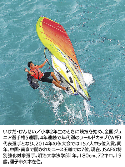 ウインドサーフィンのメッカ、逗子海岸。この海から巣立ち、世界の頂点を目指して研鑽を重ねている未完の大器がいる。今年で20歳を迎えるウインドサーファー、池田健星。昨年9月、江の島で開催されたRS:X級の世界選手権で、日本人男子選手としては2位につけた。今年はシニア転向2年目を迎え、2020年東京五輪も視野にさらなる飛躍を目指す。《敬称略》