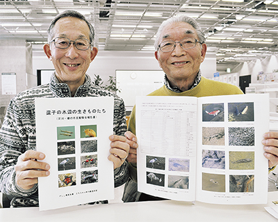 観察会で確認した魚類は計61種。中には40年ぶりに見つかったという貴重な「ホトケドジョウ」や田越川では初めて発見されたとされるカジカの仲間「カマキリ」などもある。冊子を編集した礒貝高弘さん(78)と小林宏一郎さん(79)によると、田越川は河口が広く川底がなだらかなため、淡水魚だけでなく海水魚が多く生息するのが特徴。ただ多様性がある一方で外来魚も多く、生態系に深刻な影響を及ぼすとされるオオクチバスなども確認された。