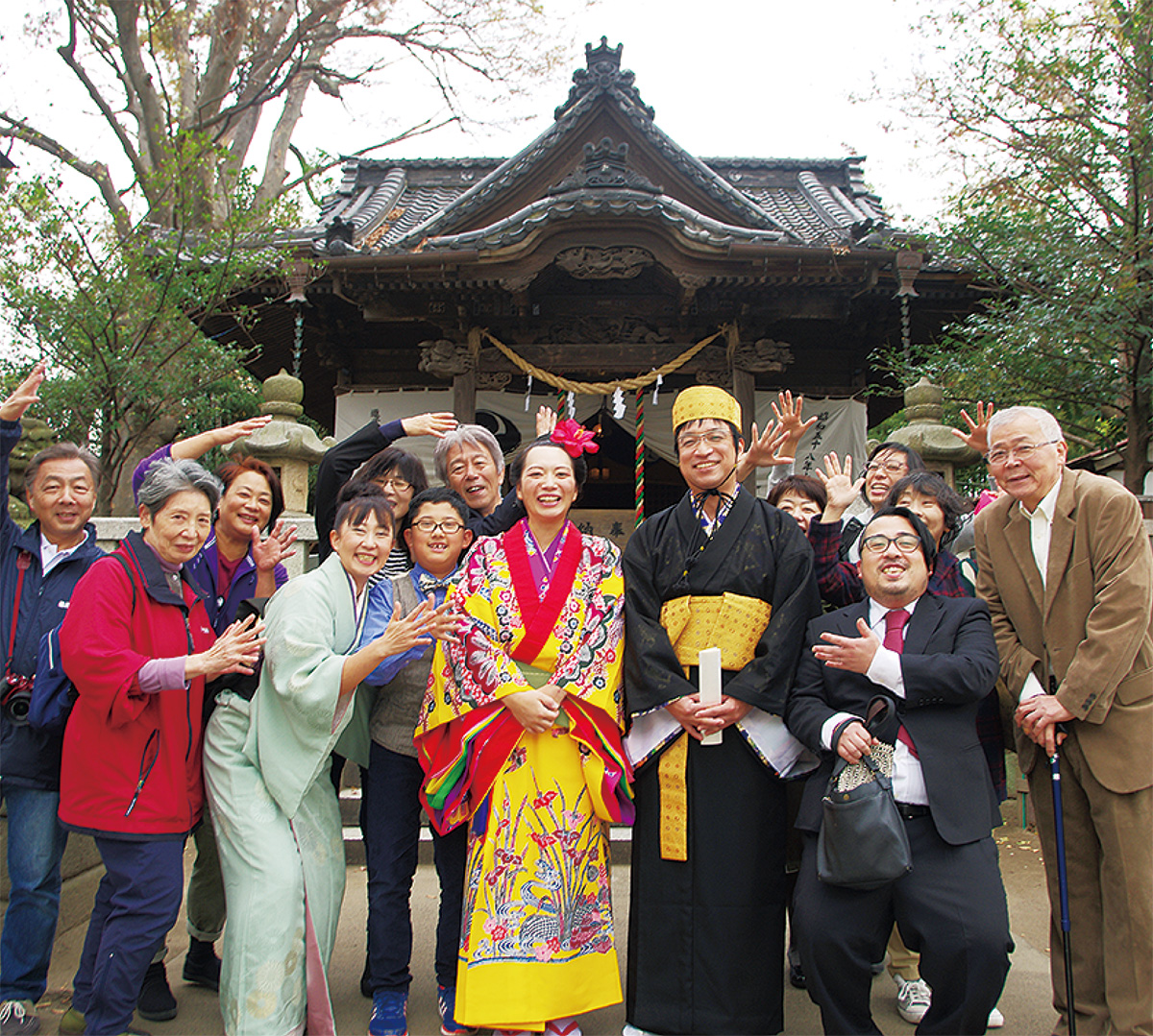 逗子市立図書館前にある沖縄料理店「くくる食堂」で働く長坂光沙子(みさこ)さんと横浜市で飲食店に勤める修さんが11月13日、逗子の鎮守・亀岡八幡宮で結婚式を行った。