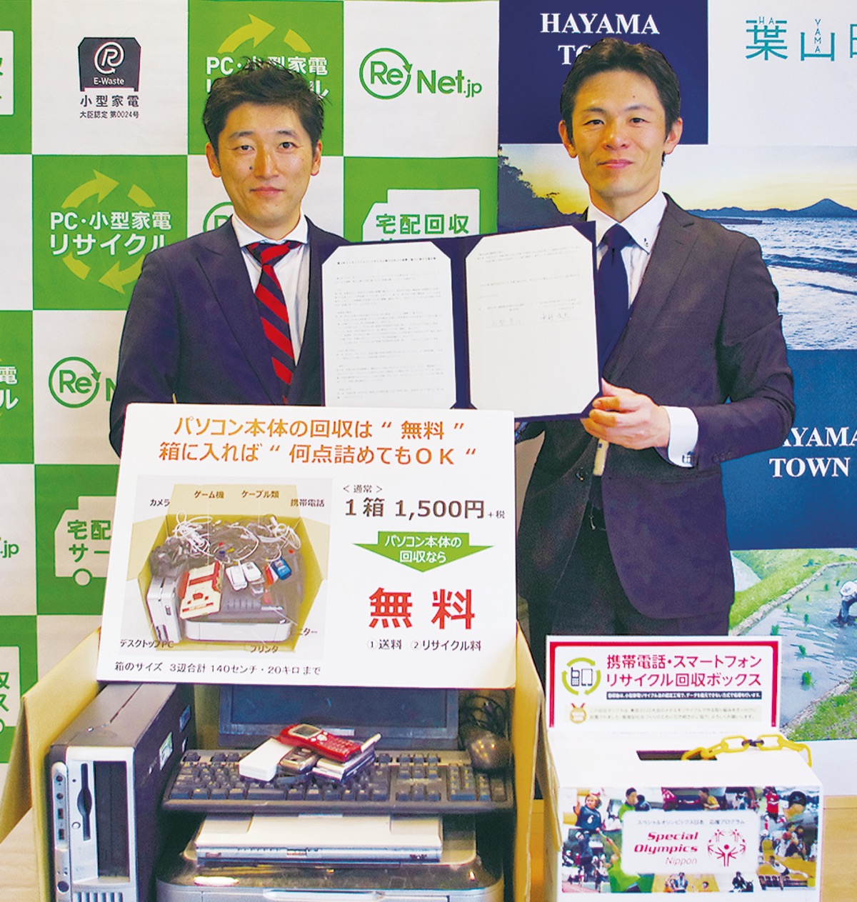 町は先月28日、リネットジャパンリサイクル株式会社(中村俊夫代表取締役社長)と協定を締結。同日から宅配便を活用した使用済みパソコンや小型家電の回収を開始した。