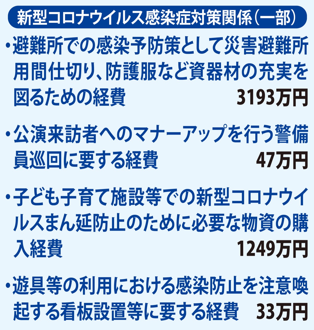 新型コロナ関係では、避難所での感染予防策として、資器材の充実を図るための経費3193万円を計上。子ども・子育て支援施設等での新型コロナまん延防止のために必要な消毒用アルコールやマスク、非接触式体温計などを一括購入し、各施設に配布する費用1249万円などを盛り込んだ。