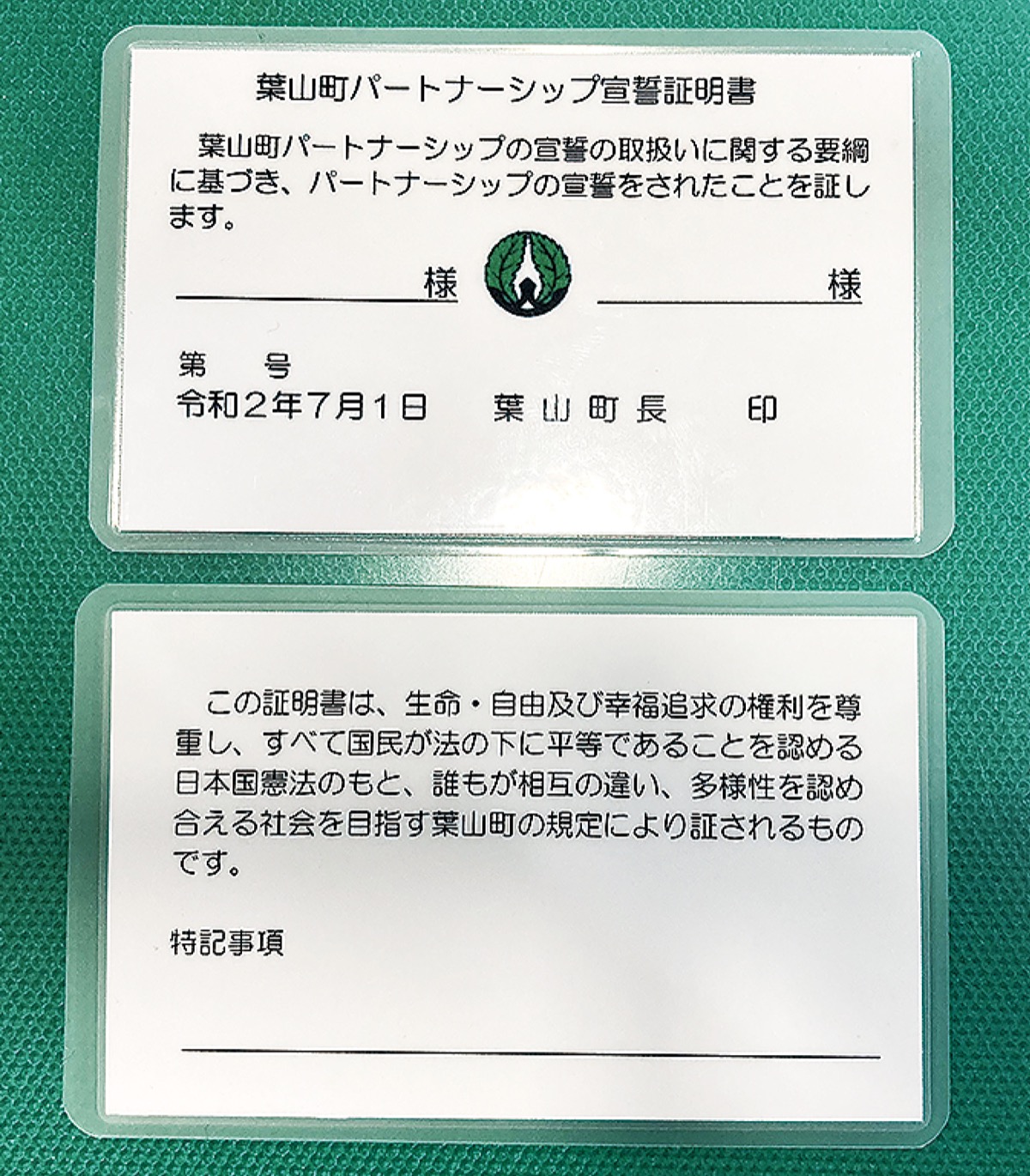 町はこの制度を「互いを人生のパートナーとして、経済的にも精神的にも支え合い、協力し合って生活することを約した関係にあることを葉山町が確認し、公に証明するもの」と定義。役場庁舎内会議室で宣誓した後、証明書(=写真)を交付する。性的マイノリティのカップルのほか、事実婚も対象となり、宣誓証明書を持っていることで、県営や町営住宅への入居申し込みができるようになる。