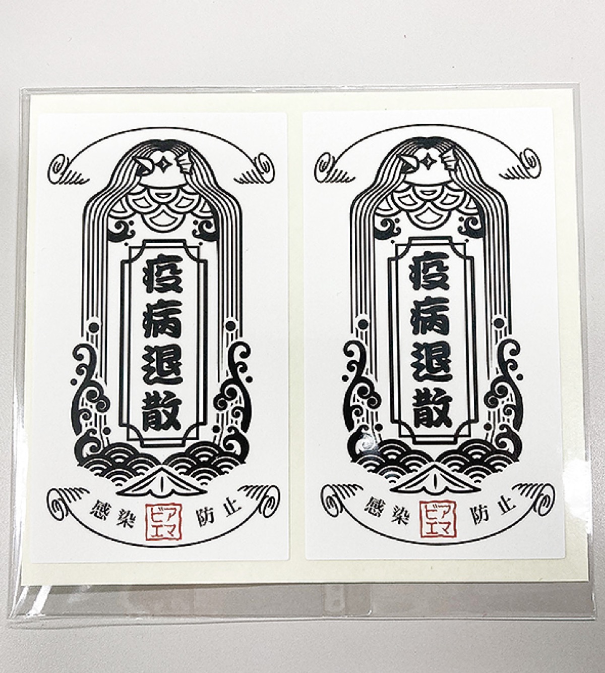 逗子市の池田通りにある「はんこ屋さん21逗子店」で、疫病退散の御利益があるとされる妖怪アマビエのオリジナルステッカーが人気を集めている。「願いを込め、お店や家に貼っていただけたら」と店主の丸山広宣さん。2枚組500円で販売している。