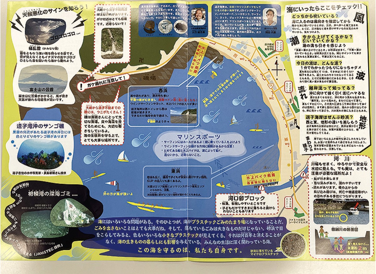 逗子マリン連盟や逗子サーフライフセービングクラブ、小坪漁業協同組合、逗子海岸営業協同組合、市観光協会などの市内団体からなるわっしょい逗子海岸実行委員会が担当した。これまで、海辺を安全に楽しむ体験会や逗子の山の魅力を伝える事業を実施してきた同団体。コロナ禍でそうした事業が行えない中、夏休みにあわせて市立小中学校へ配布した。水辺の事故でよくあるパターンや危険な生き物の写真、クラゲに刺された時の対処法、溺れている人を見つけた際の対応のほか、逗子湾の絵に特徴を記入。一目で危険な場所や注意すべき点がわかるようデザインした。