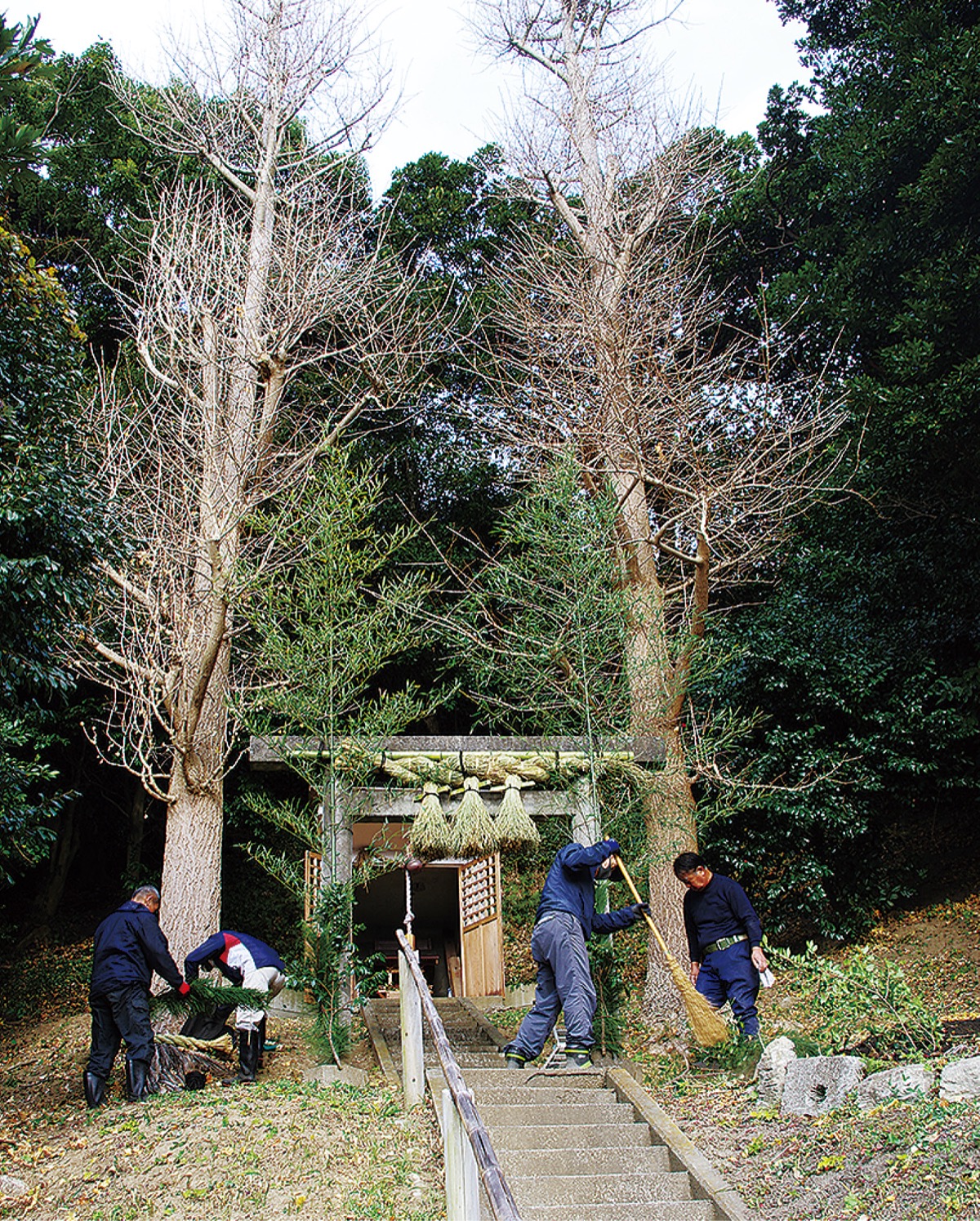 葉山町上山口の須の宮神社で先月29日、氏子会の会員たちによる本殿の清掃やしめ縄の付け替え作業などが行われた。