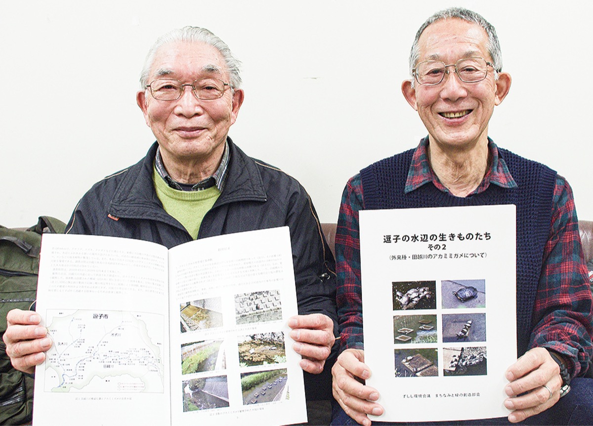 観察を続ける中で外来種のカメやコイにエサを与える市民や、それを楽しそうに見る親子の姿を見たという2人。「外来種が棲みつく要素になるだけでなく、エサ自体が環境汚染になる。未来を担う子どもたちにとって、こうした景色が当たり前になっては欲しくない」と語る礒貝さん。田越川のアカミミガメはいずれもペットとして飼育されていたとみられ、小林さんは「飼えなくなって可哀そうだから自然に放す、という行動が自然界のバランスを崩す。もとに戻すのはとても大変なこと」と警鐘を鳴らす。「この冊子は市民が足元の環境を観察した記録集。これをきっかけに、日常生活のすぐそばにある自然に目を向ける人が増えてほしい」とし、「今後も調査を続けていきたい」と2人は意気込みを新たにしていた。冊子は逗子・葉山両図書館のほか、同団体フェイスブックページでも公開している。
