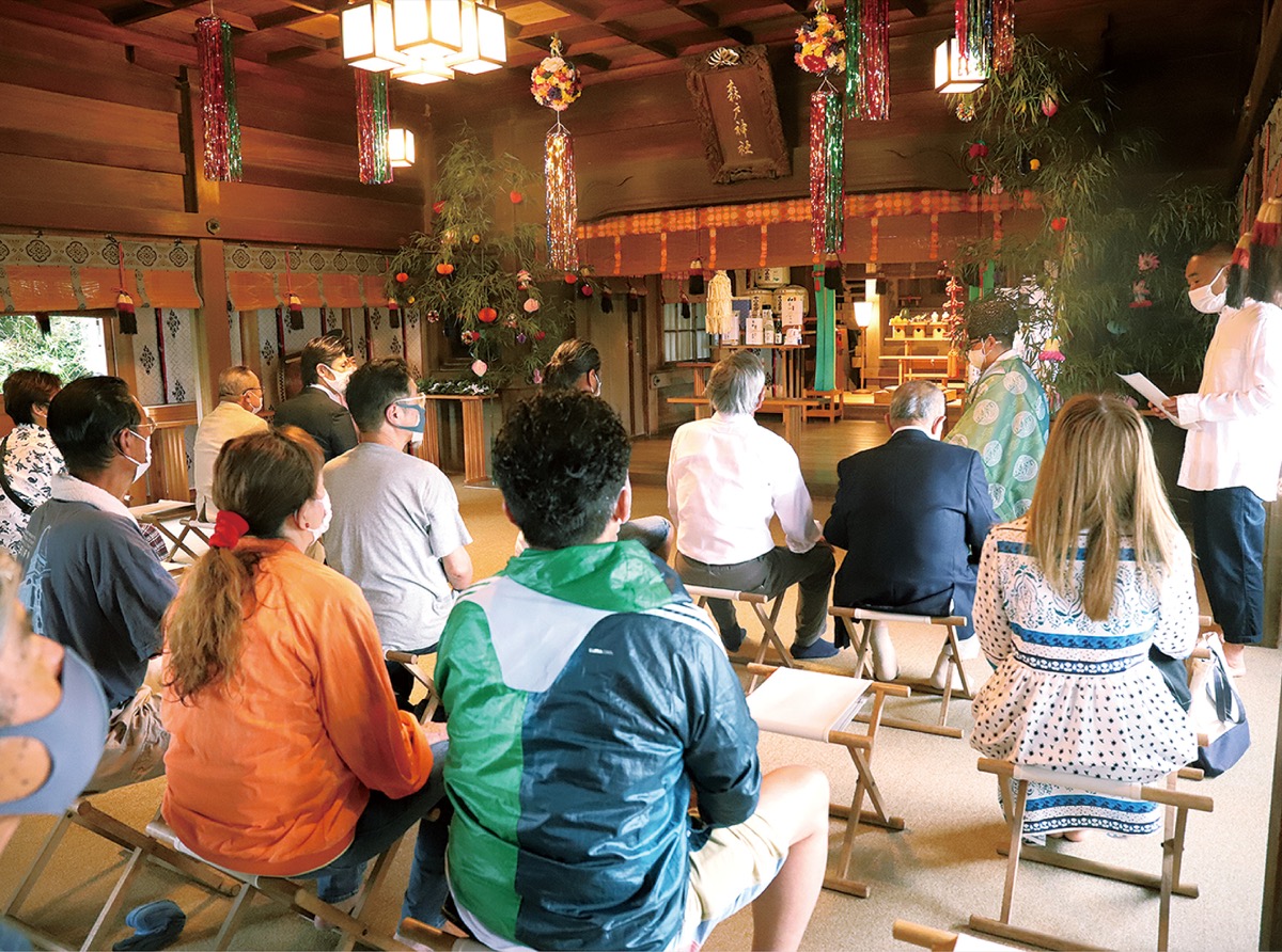 あいにくの雨となった海開き当日の今月2日、森戸神社本殿で海上保全祭が行われた。山梨崇仁町長や栁新一郎商工会長のほか、森戸、一色、長者ヶ崎・大浜海水浴場の関係者らが出席。今夏の海岸の安心安全を祈った。
