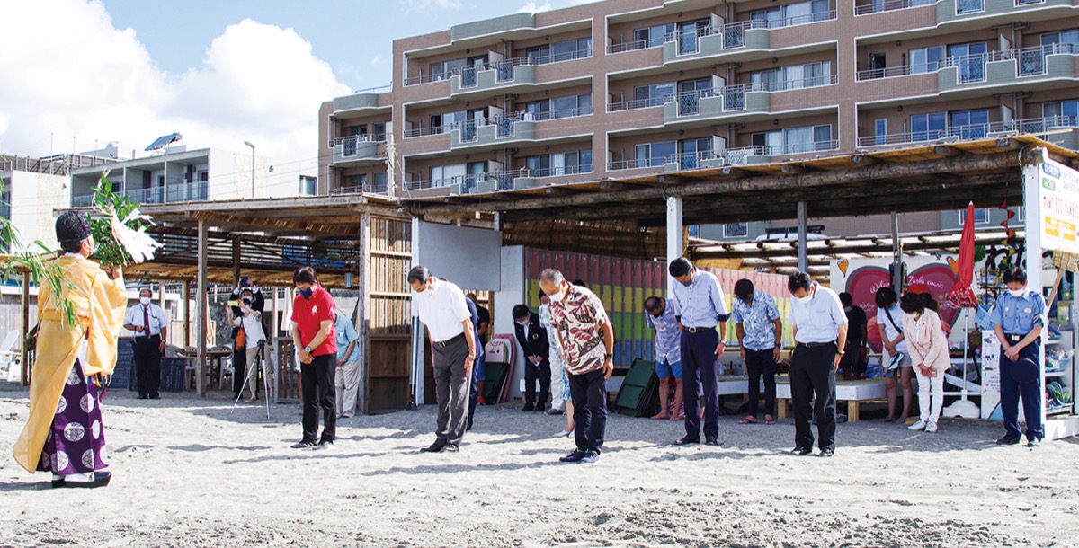 梅雨明けらしい快晴となった16日、安全祈願祭が開催された。例年、地元の小学生が海に飛び込む賑やかな式典は今年も取りやめになったが、当日は海の家事業者のほか、桐ケ谷覚逗子市長や地元選出の近藤大輔県議、早稲田夕季衆院議員、山本朋広衆院議員らが参加。今夏の海岸の安心安全を祈った。