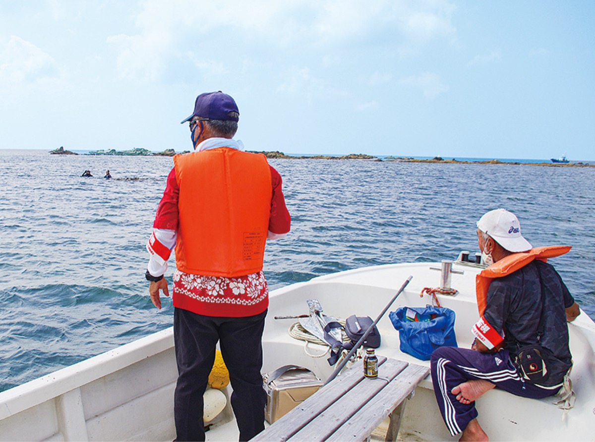 8月29日には、鐙摺港から長者ヶ崎までパトロールを実施=写真。岩場で潜っている人たちに声をかけた。近年、磯焼けなどによって漁獲量が減少しており「持続可能な漁業をしていくうえでも密漁は絶対にダメ」と組合員は話していた。