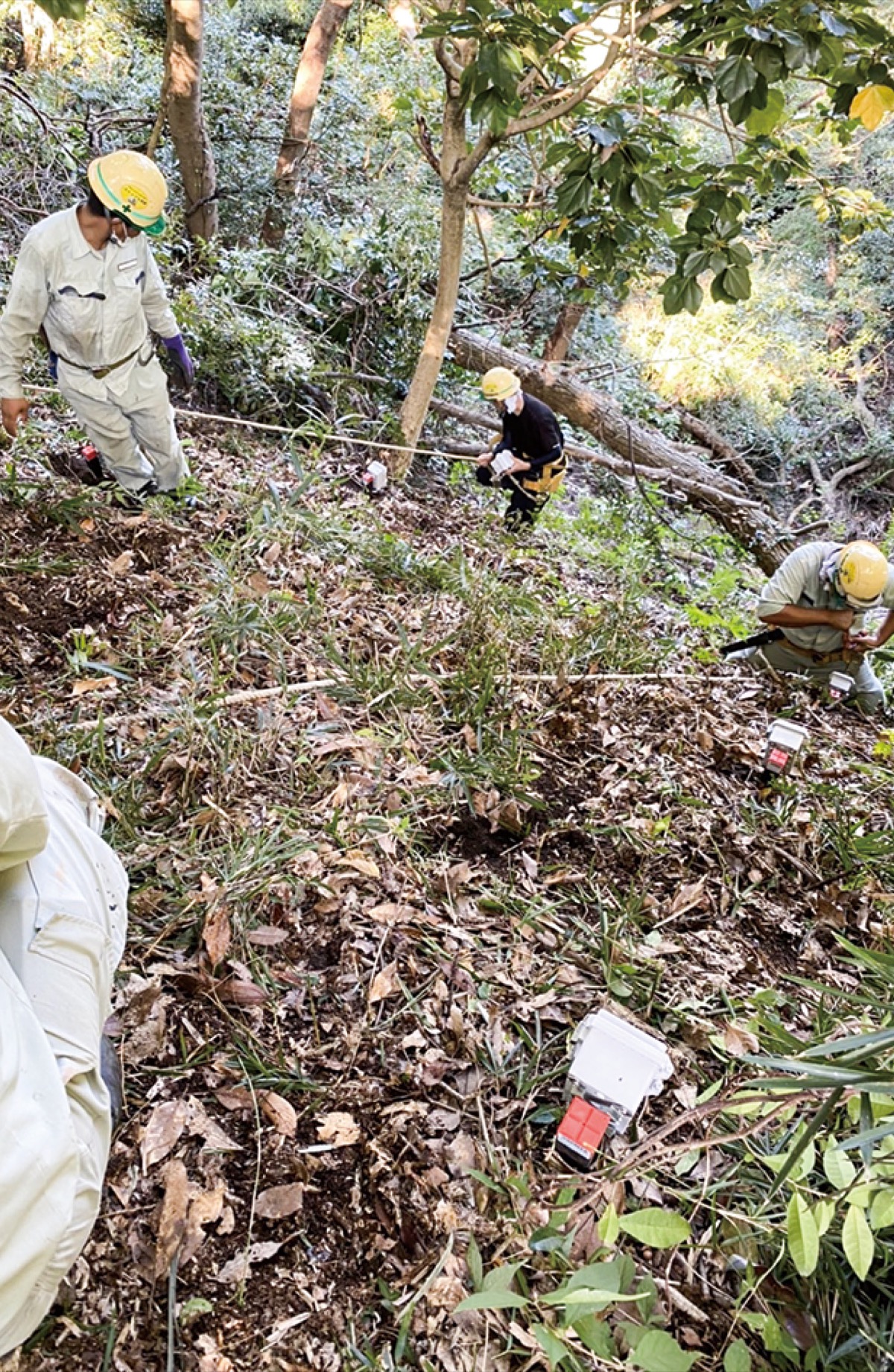 10月15日には、土砂崩れが発生した池子の森自然公園内のり面に、加速度センサーと通信機能を持ったアイ・サイナップ社の「ミテテル傾斜計2」を設置した。前後左右の衝撃や傾斜の発生を感知した際、携帯通信網(4G)を通じてクラウドにデータが届き、いつ・どこからでも確認できるほか、登録者へメールでの通知も可能。また土中水分センサーを搭載しているのも特徴だ。同社IoT推進本部本部長の緒方秀俊さんは「地表の変化をいち早く伝えるだけでなく、土中水分量と傾斜の変化の関係を探り、予兆検知につなげたい」とする。