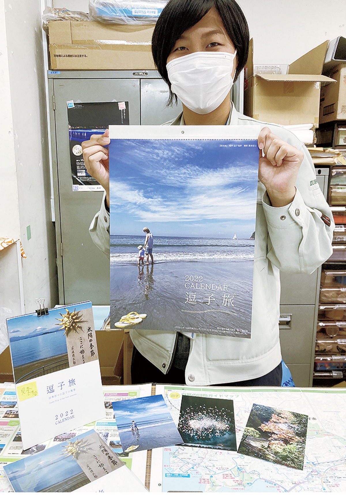 定番の海岸や花火のほか、秋の神武寺や雨上がりの商店街など、フォトコンテストで入賞した13作品を収録。壁掛けタイプ(A3)と全てのページがポストカードになる卓上タイプ(A5)を用意した。それぞれ税込550円。