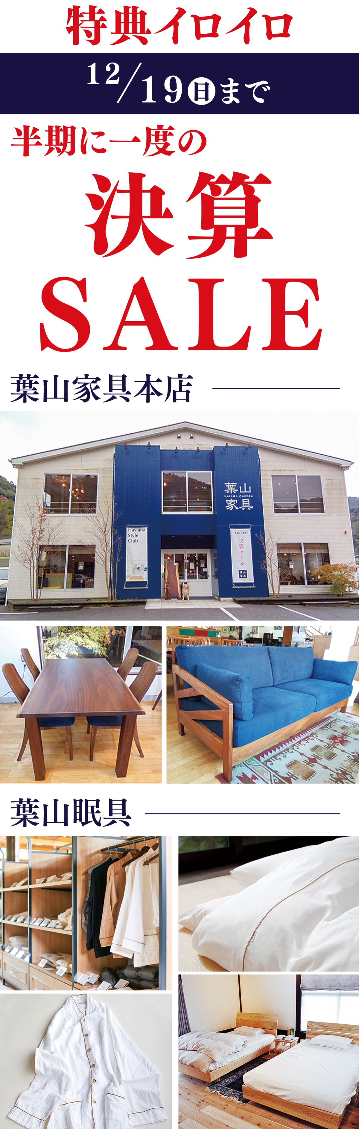 使い込むほどに風合いの増すオリジナル無垢板家具の葉山家具と、天然素材にこだわった眠り周りのアイテムを揃え、今年2月の開店ながら話題を呼んでいる葉山眠具。両店では現在、半期に一度のセールを開催中。12月19日(日)まで。