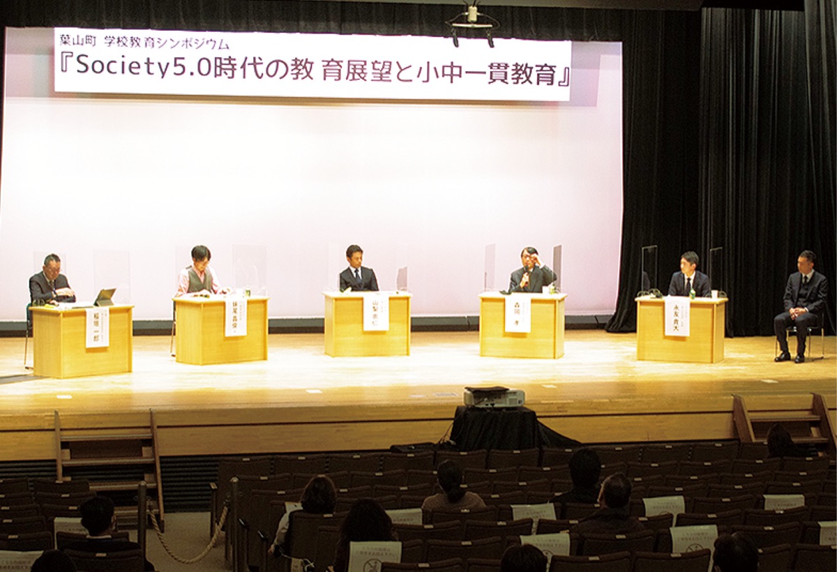 その後、妹尾さんと小吹さん、南郷中学の森岡孝校長、葉山中学の永友貴大教諭、山梨崇仁町長がパネルディスカッションに登壇。稲垣教育長が司会を務めた=写真。多忙な現場教員が置かれている状況や地域との関わり方、葉山ならではの教育スタイルの醸成・発信など多岐にわたる意見を交換。スマホで検索すれば簡単に知識を得られる現代において求められる教育について、議論を深めた。