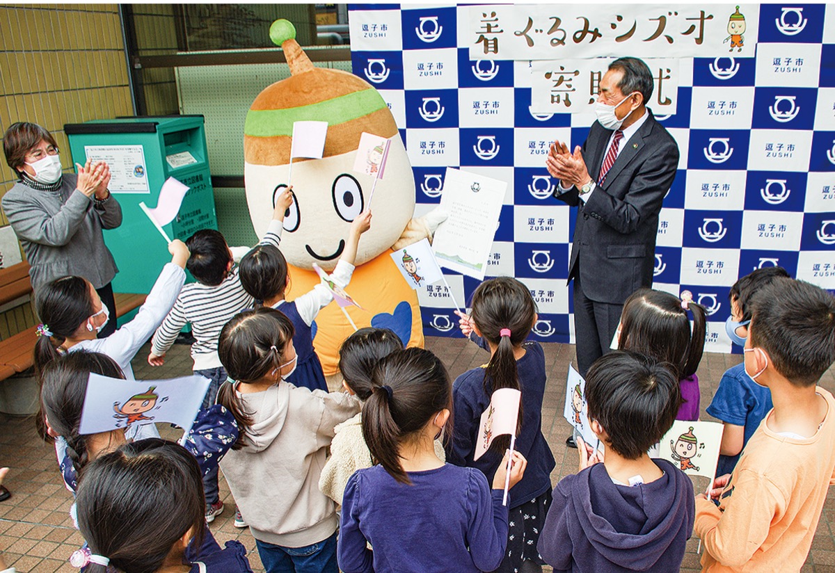 寄贈式の後、シズオは桐ケ谷覚市長から「特殊勤務職員」の辞令交付を受けた。子ども会連絡協議会から市役所へと「移籍」したシズオは「市職員になれてとっても嬉しい。これからもいろいろな場所に出ていくのでよろしくね」と意気込みを語り、集まった市立逗子小学校の子ども達が「頑張って」とエールを送っていた。