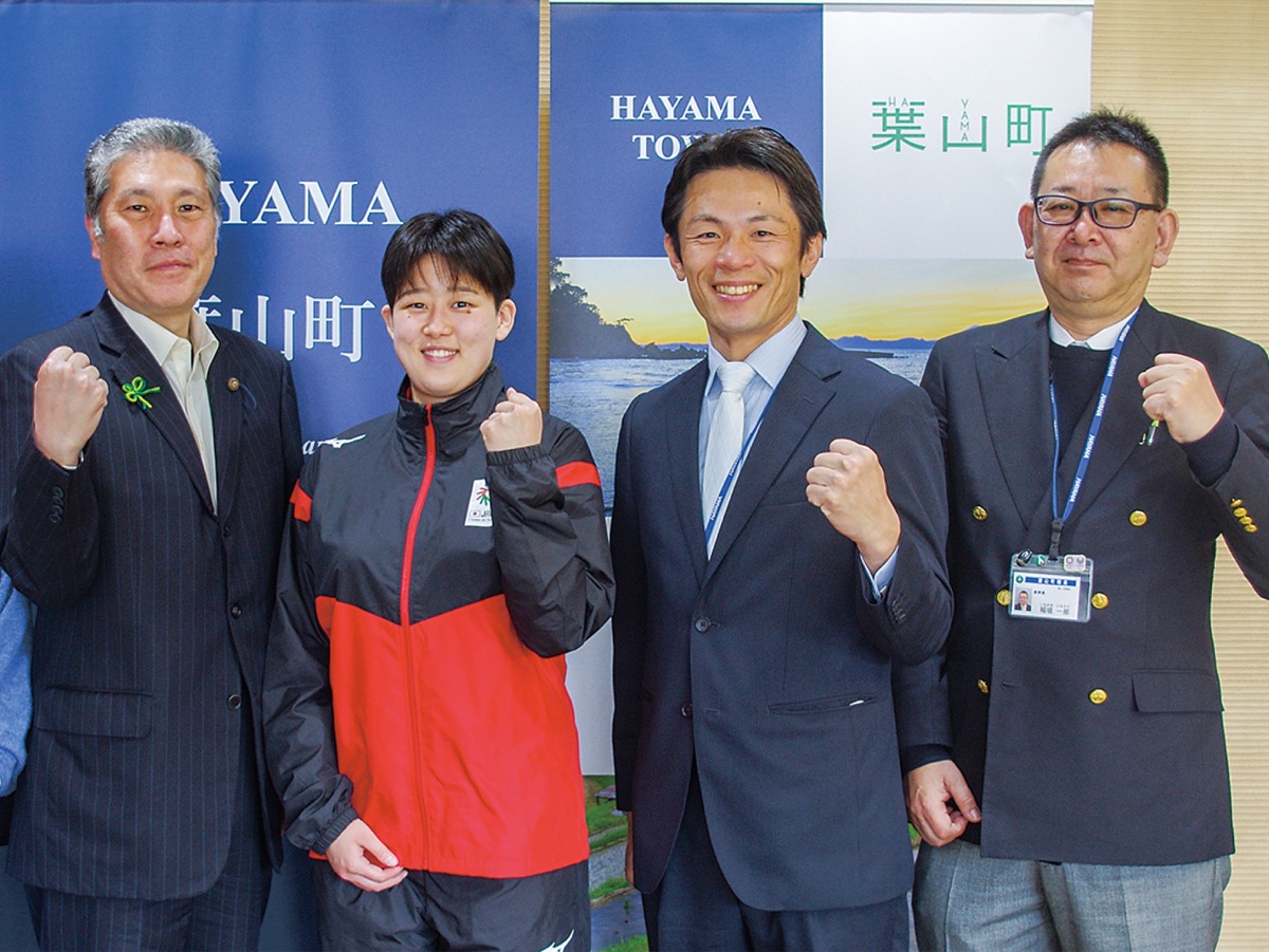 葉山町出身でデフバレーボール日本代表の中田美緒さん=人物風土記で紹介=が、4月7日、山梨崇仁町長を表敬訪問した。