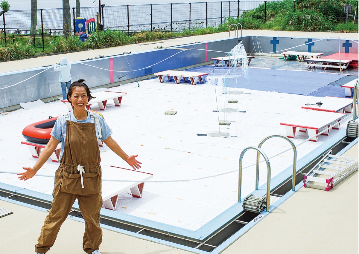 相模湾が眼前に広がる25メートルプールは会期中、水を張る。来場者は小型ボートに乗って作品を間近に見ることができるという。