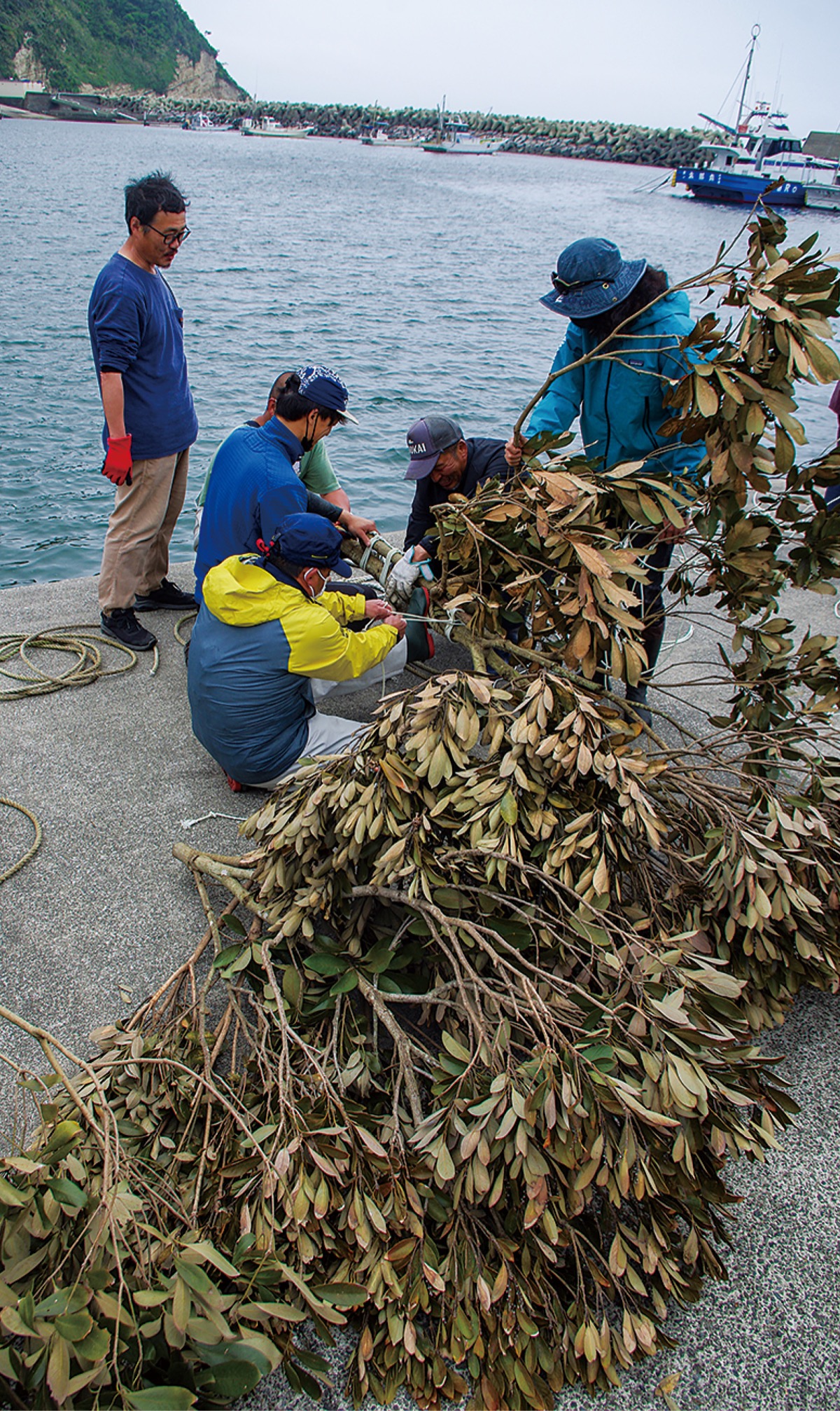 こうした状況に危機感を持った関係者たちは、産卵期を前にした4月16日、披露山の木々の維持管理剪定で発生した間伐材を活用して、アオリイカの産卵床を3つ制作。漁港で漁師や関係者がシイの木のサイズを整えて束ね、重りを繋げるためのロープを結びつける作業を実施した。この日は海が荒れていたため、28日に逗子・葉山ダイビングリゾートの協力のもと、小坪漁港の沖合10〜20mほどの複数地点に設置した。