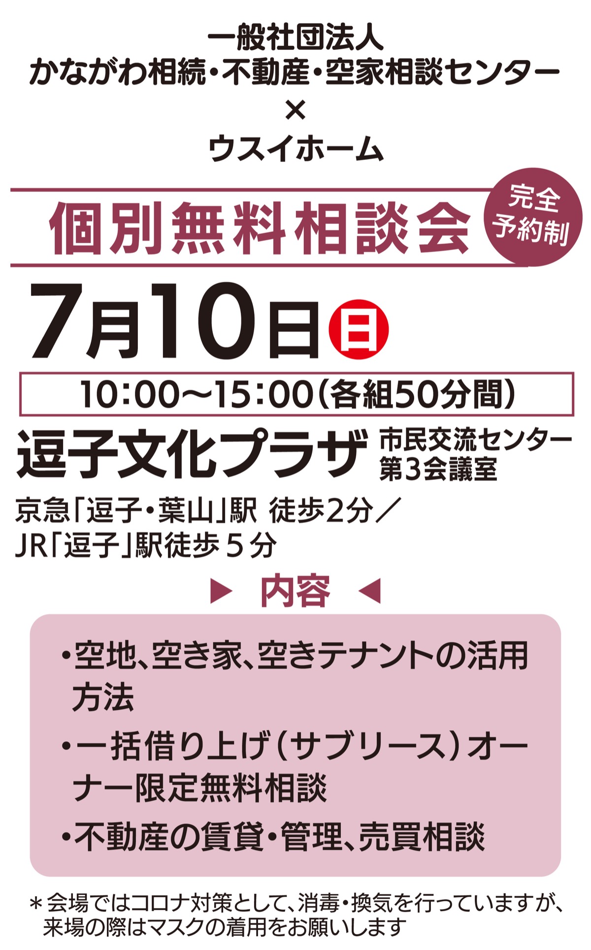 7月10日(日)に逗子文化プラザ市民交流センターで開催される相談会は、横須賀・湘南・横浜を中心に県内で不動産事業を展開する(株)ウスイホームとの共催。多様な不動産の「悩み」に対応する。