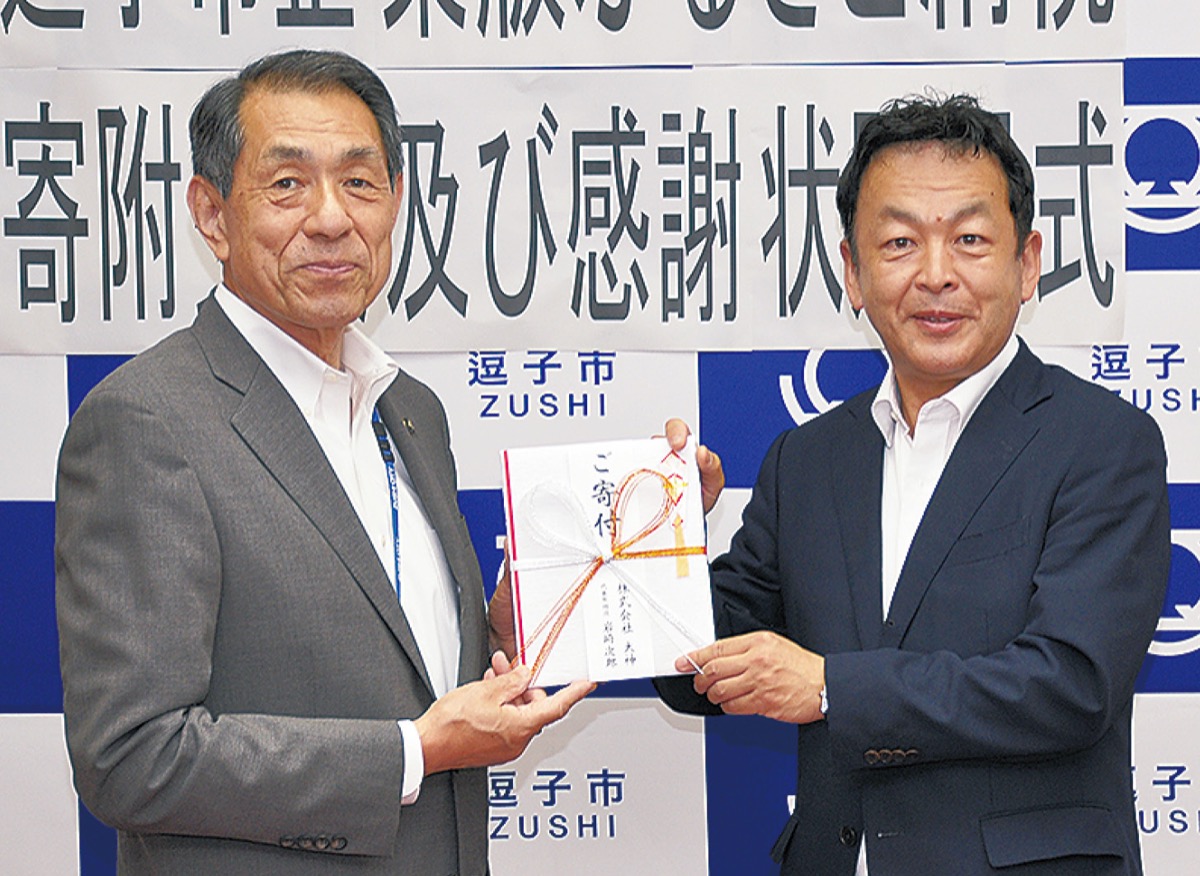 総合建設業の(株)大神(本社=横須賀市)は、逗子市に企業版ふるさと納税制度を使った寄附を行った。寄附額は50万円。6月24日に同社の岩崎次郎代表取締役が市役所を訪れ、桐ケ谷覚市長に手渡した=写真。