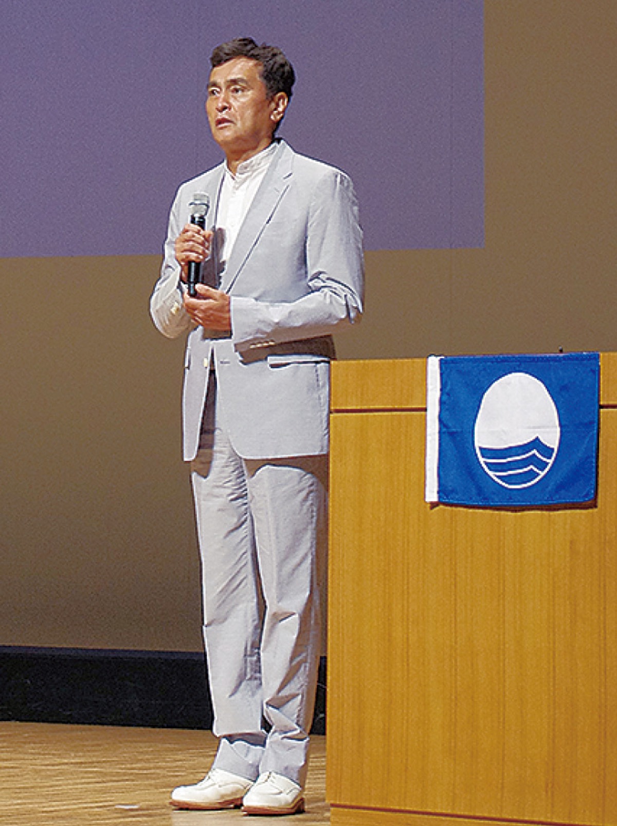 当日は、逗子海岸の認証取得をサポートした一般社団法人日本ブルーフラッグ協会代表理事の片山清宏さんが登壇。概要や意義を話し、逗子市広報大使の石原良純さんも駆けつけた=写真右。石原さんは「子どもの時は逗子海岸はもちろん、マリーナの岸壁で魚をとって遊んでいた」と回顧。夏の湿気のある暖かい風が海から吹くと、披露山や桜山の上に雲ができるのを見て興味を持ち、「気象予報士を目指すきっかけとなった」とした。史上最速での梅雨明けにも触れ、「明らかに異常。きれいな海を守るのは、ぼくらの役目」と話していた。