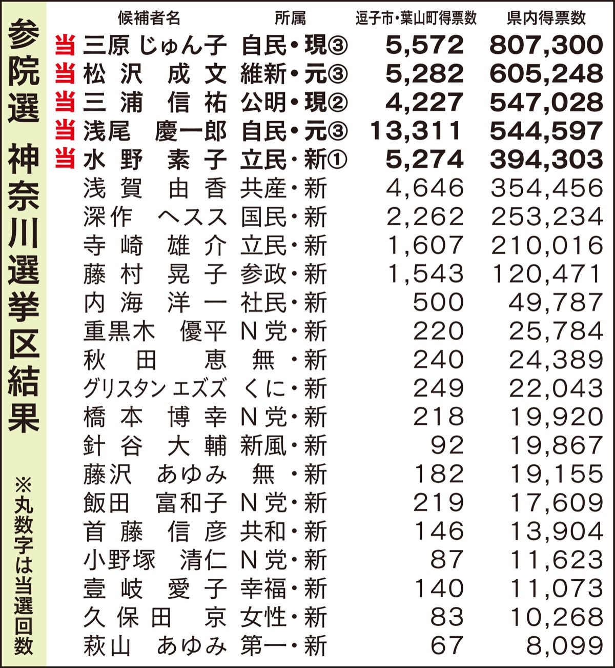 参議院議員選挙の投開票が7月10日に行われた。改選4と欠員補充1の計5議席を過去最多の22人で争った神奈川選挙区は、自民党の現職・三原じゅん子氏(57)が約80万7千票を獲得し、トップ当選。以下、日本維新の会の元職・松沢成文氏(64)、公明党の現職・三浦信祐氏(47)、自民党の元職・浅尾慶一郎氏(58)、立憲民主党の新人・水野素子氏(52)が当選した。