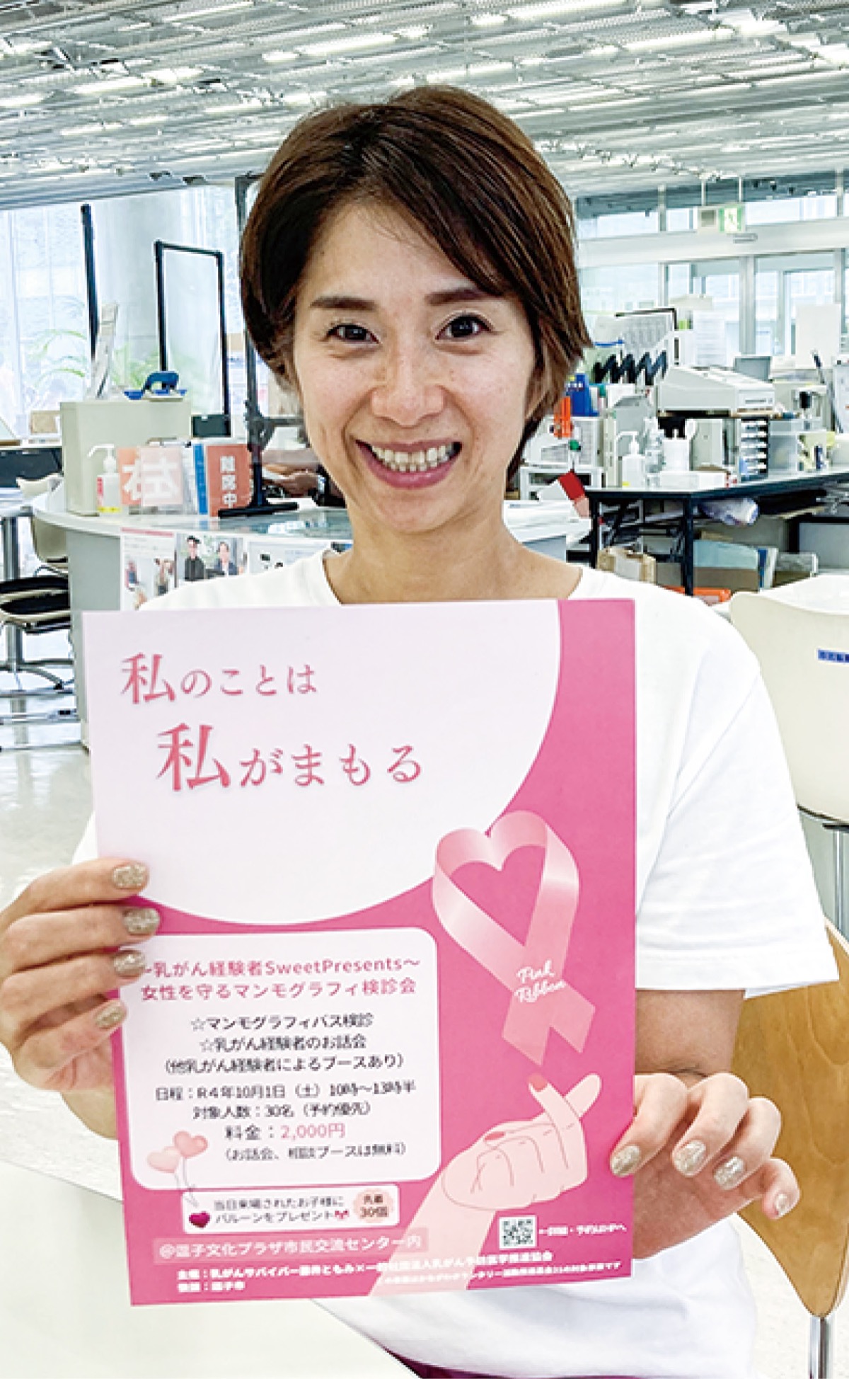 逗子市在住で3度の乳がんを経験した藤井ともみさん=人物風土記で紹介=と、一般社団法人乳がん予防医学推進協会の主催。