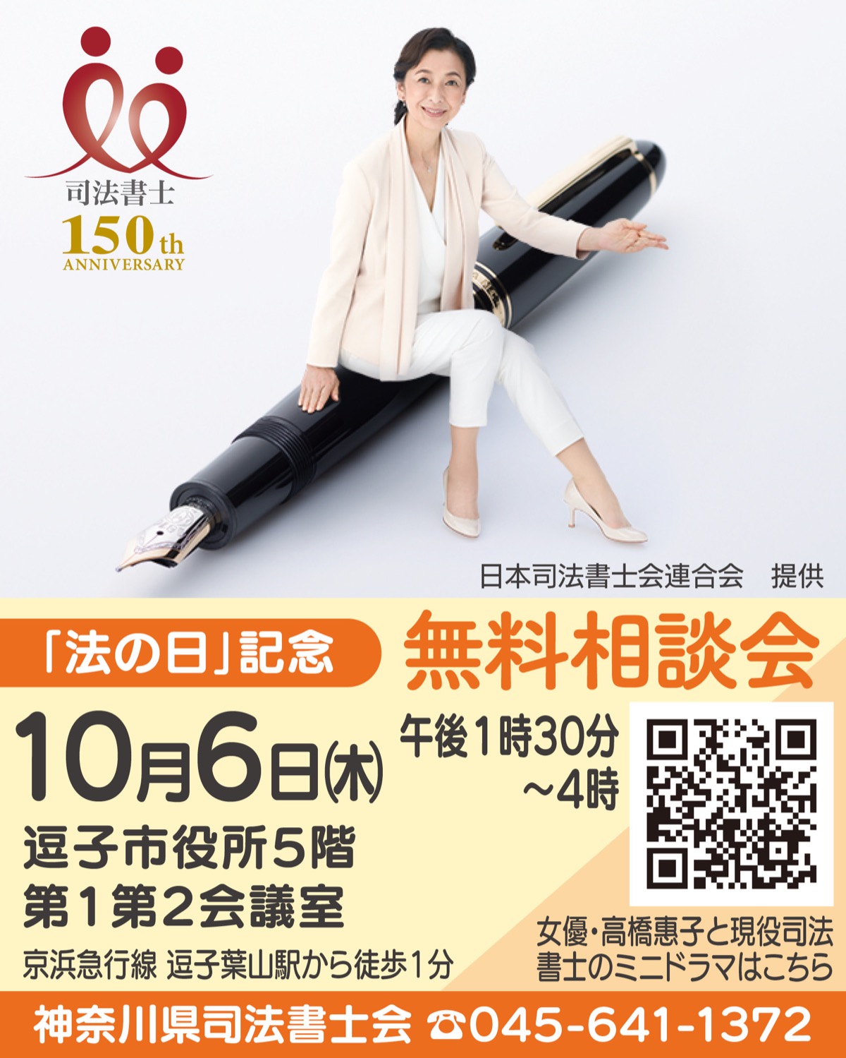 神奈川県司法書士会横須賀支部は10月6日(木)、逗子市役所5階で無料の法律相談会を開催する。時間は午後1時30分から4時まで。予約不要のため、直接会場へ。