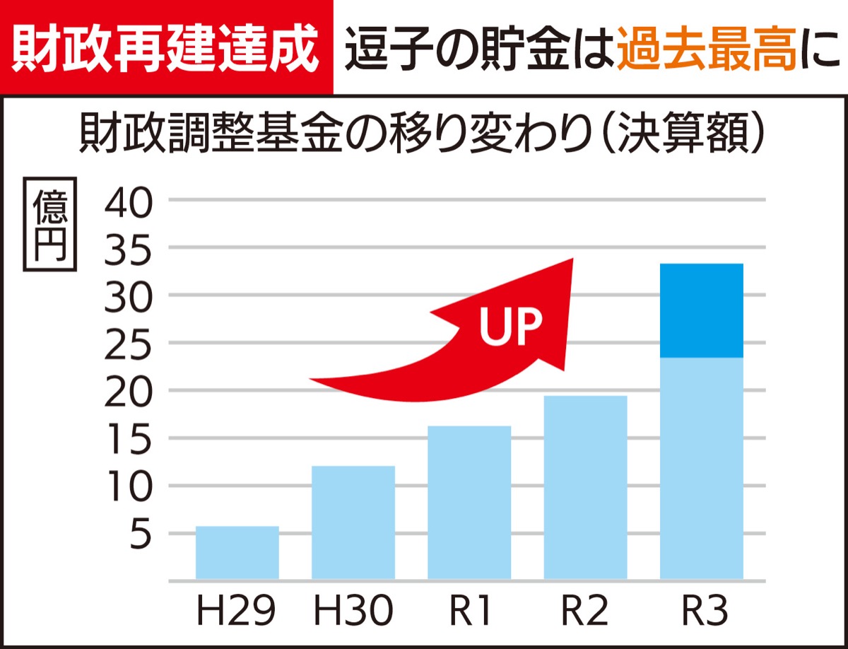 また、コロナ禍にありながら「政策の一丁目一番地」と掲げていた財政再建を達成。2017年には5・1億円まで落ち込んだ財政調整基金(市の貯金)は、昨年度決算ベースで23・7億円となり、新たに「公共公益施設整備基金」を10億円積み立て、合計33億7千万円は逗子市政において過去最高額です。