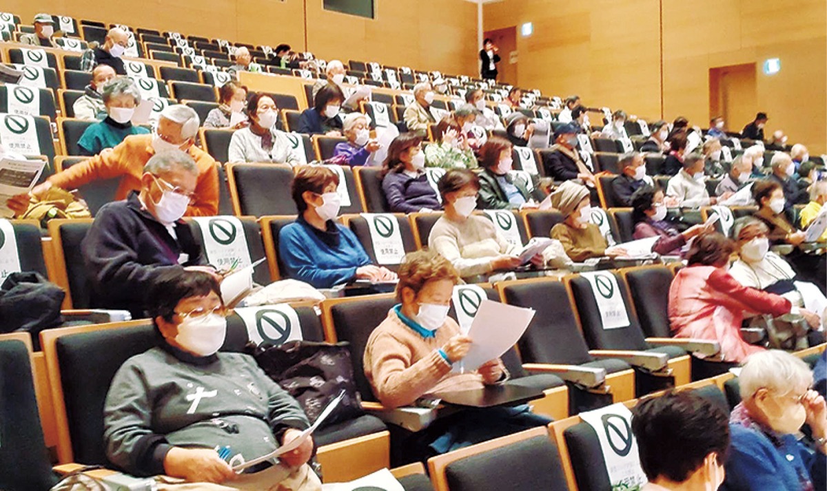 人生100年時代を豊かにしようと、10月18日と25日の2日間、老人クラブ連合会の横須賀・三浦ブロックによる「ゆめクラブ大学」が神奈川県立保健福祉大学(横須賀市)で開催された=提供写真。横須賀、鎌倉、逗子、三浦、葉山の老人クラブの会員ら400人が参加。地域包括支援システムやスポーツ栄養学、高齢期における転倒の予防などについて同大学の講師らが登壇し、参加者たちは熱心な様子でメモを取っていた。