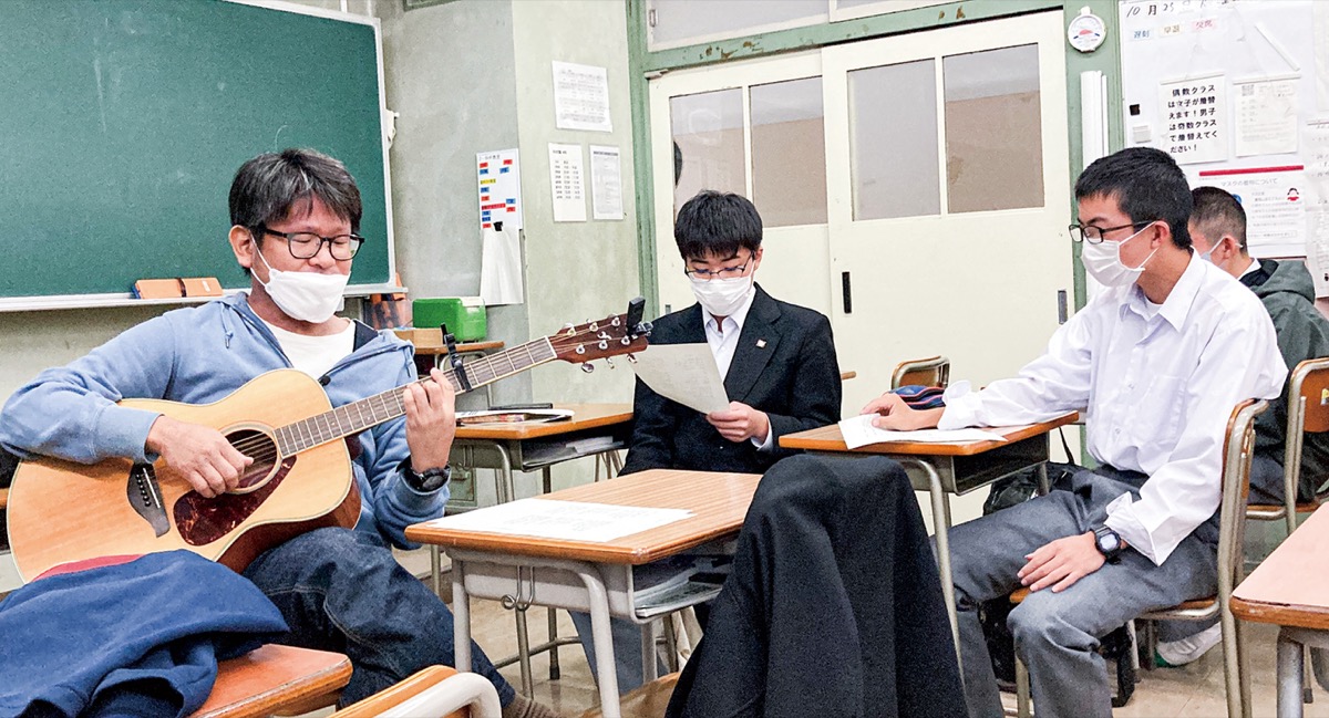 「このキーは歌いやすい?」―――。10月25日、県立逗葉高校の教室の一角では、プロのミュージシャンと生徒たちが真剣な様子で曲作りに励んでいた。