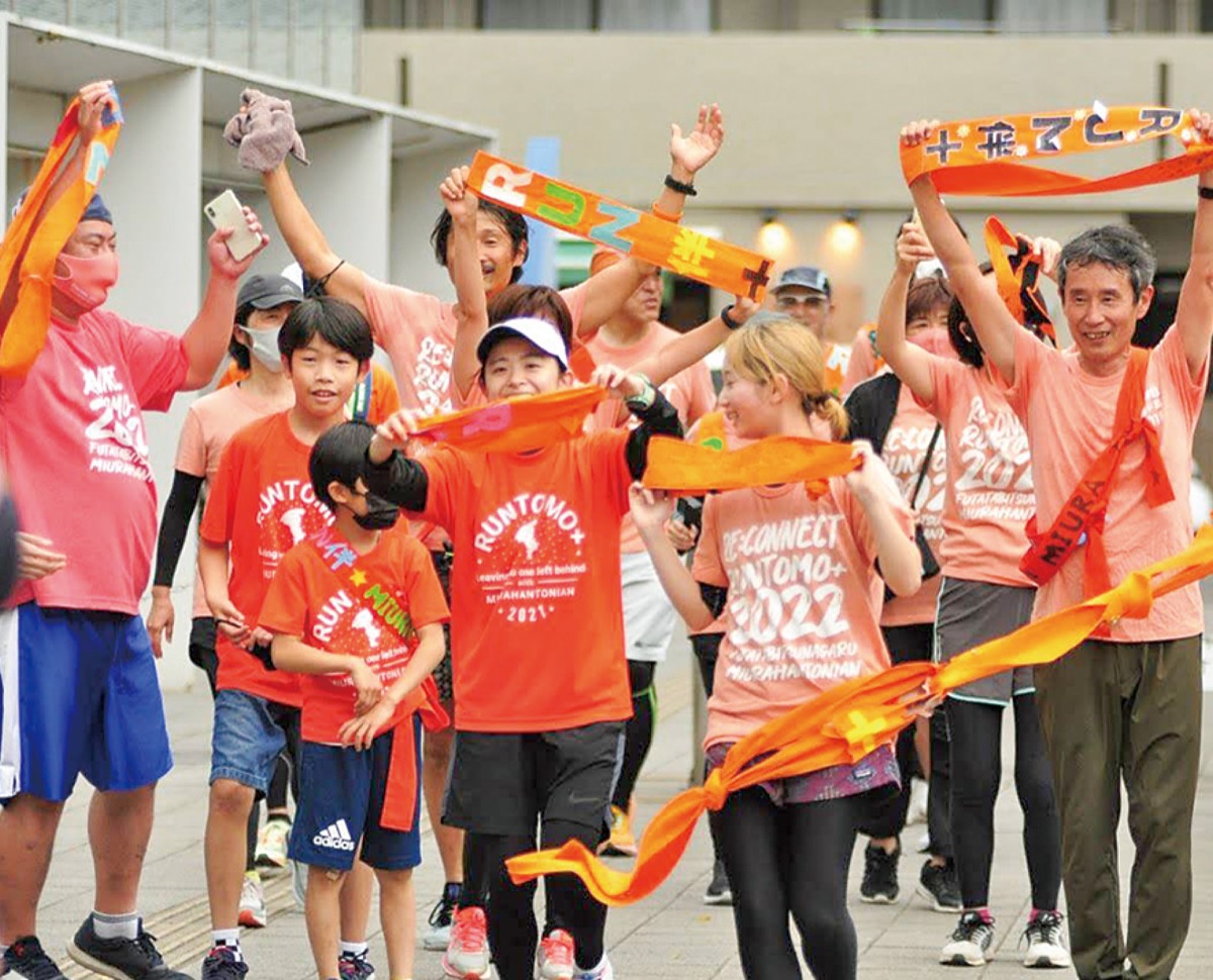 認知症支援のテーマカラーであるオレンジのTシャツとタスキを身につけ、当事者やその家族、福祉施設関係者などが走りながら啓発した。