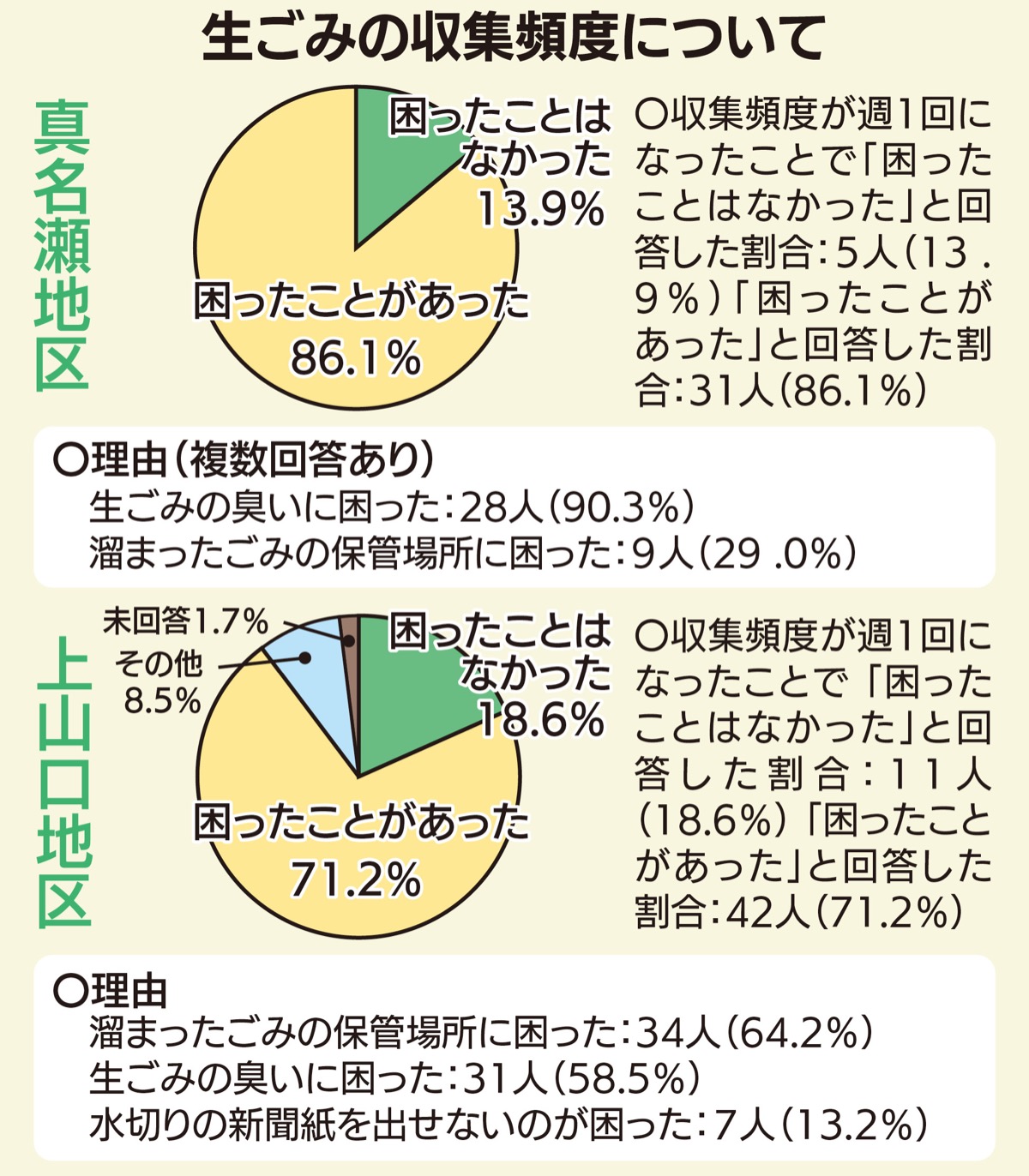 昨年10月から12月にかけて行われた上山口地区での実証実験では、生ごみの週1回収集について「畑に埋めた」などの同地区ならではの対応をしたケースが見受けられたものの、約71%が「困ったことがあった」と回答している。