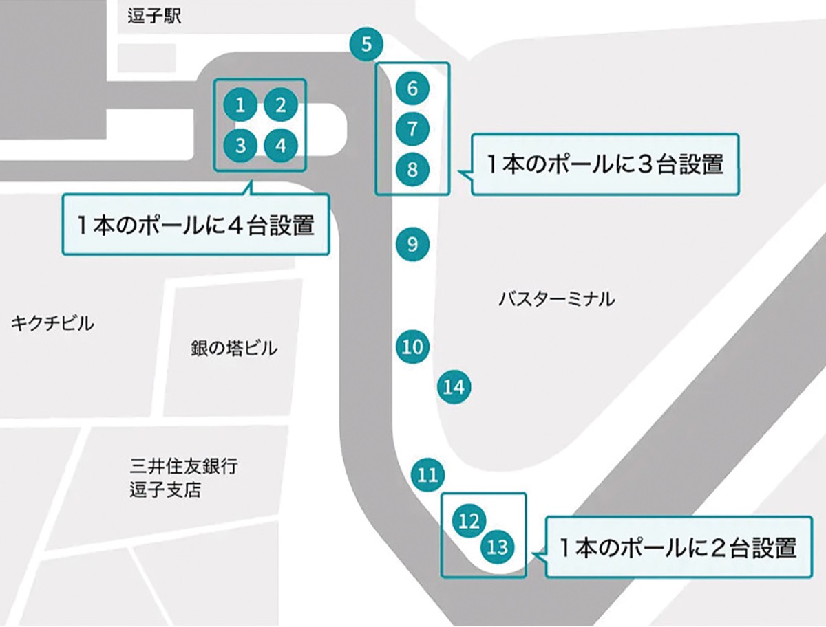 4月5日から駅前広場に計14台のカメラを設置している。期間は6月30日(金)まで。自動車や歩行者の交通量、渋滞や滞留等のデータを蓄積・分析する。市によると、5月26日(金)に予定されている花火大会の際のデータも解析するという。映像は全てクラウド上に保存されて市は所有せず、2社が個人情報保護法に基づき管理する。