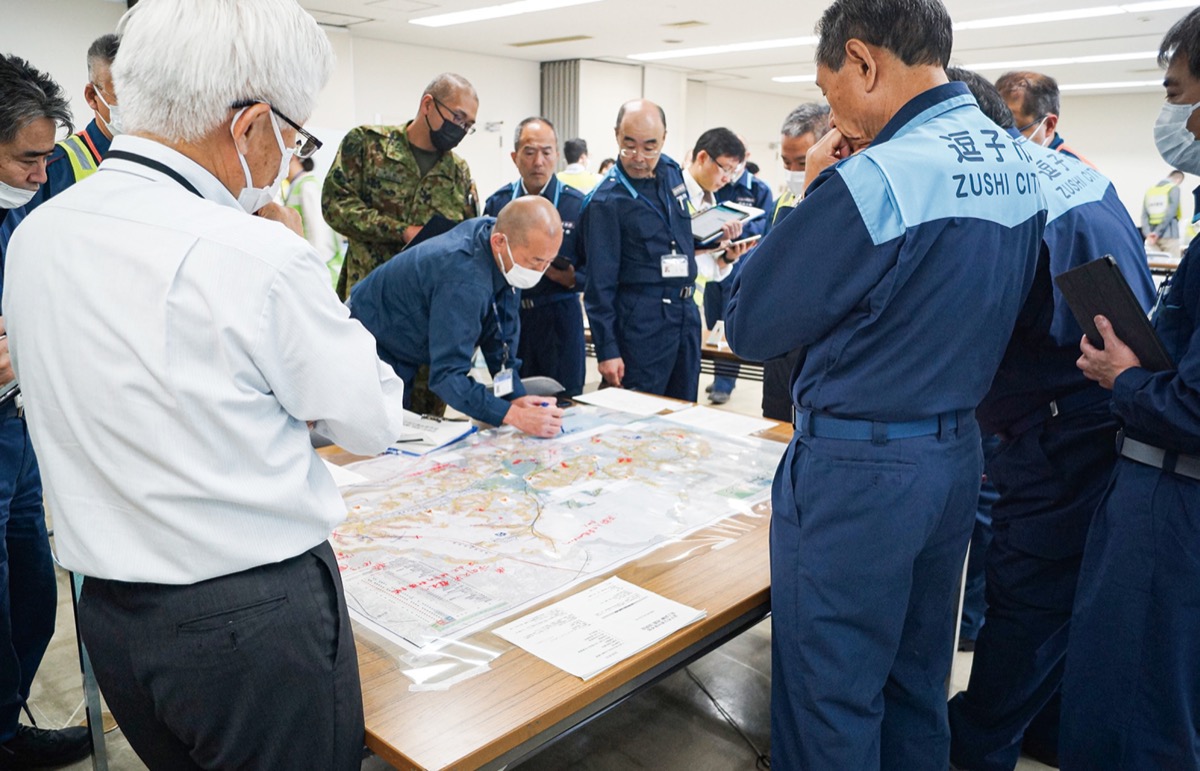 逗子市は大地震などが起きた時に設置する災害対策本部の動きを確認するため6月1日、市役所5階の会議室で災害図上訓練を行った。