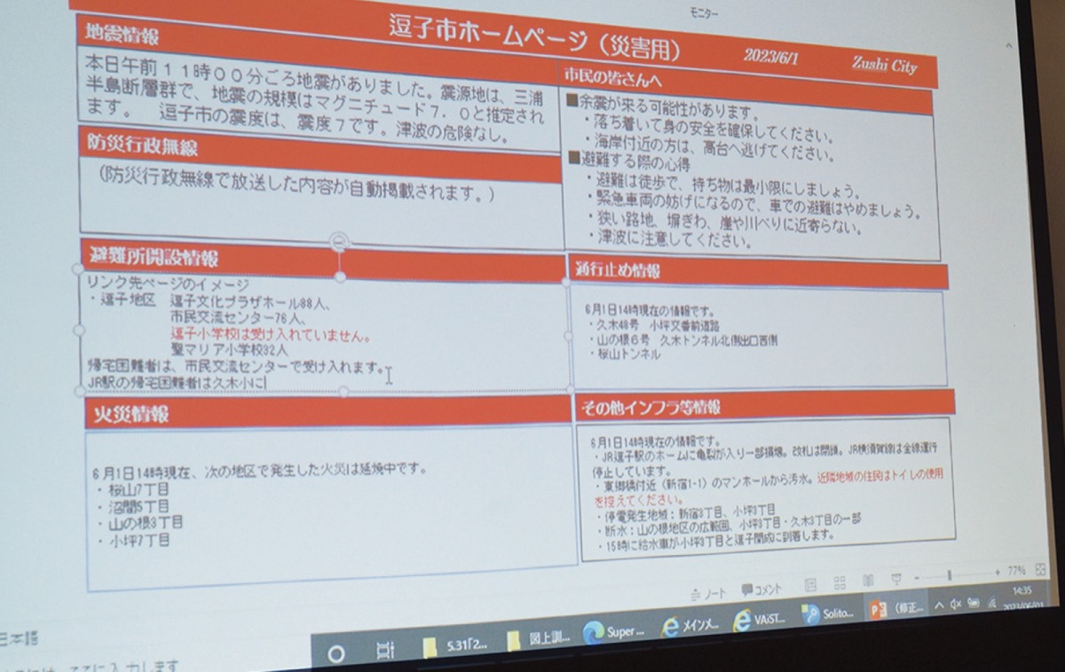 情報班は市民向けに災害用ウェブサイトを作成し、避難所開設情報、火災情報、通行止め情報、停電・断水などのインフラ情報を随時更新していった。